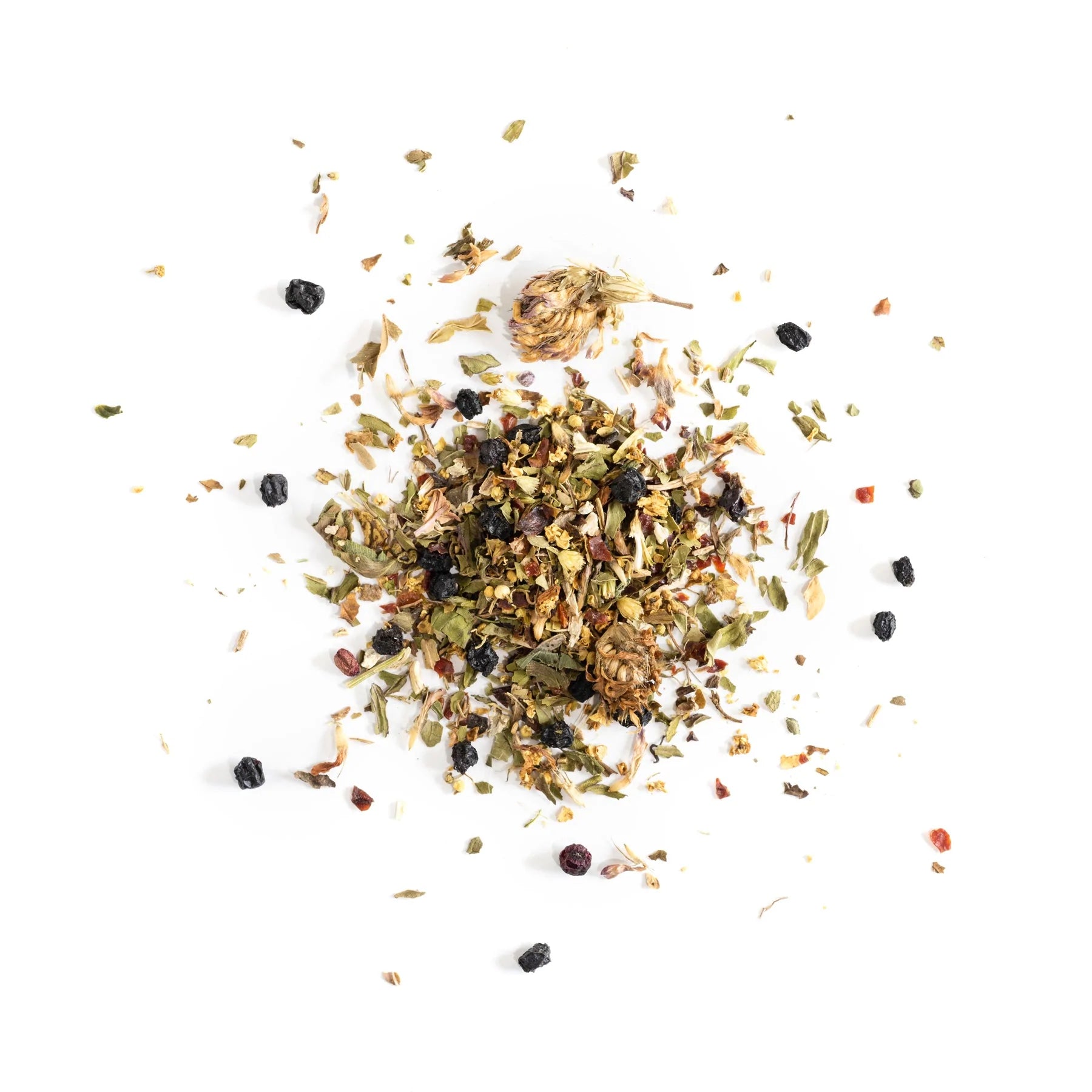 Organic rose hips, organic elderberries, organic echinacea, organic peppermint, organic elderflower, organic yarrow, organic red clover